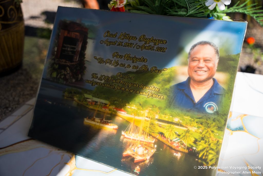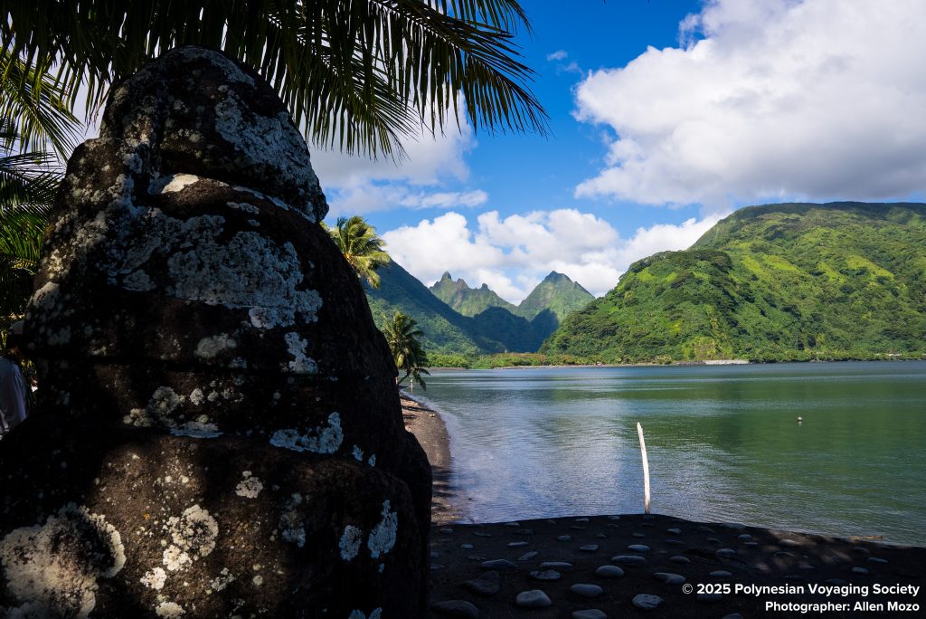 As the crews drove by car from Papeʻetē to Tautira, they made meaningful stops along the way including at a marae in Papara and a waʻa racing monument. Parts of the Tautira day trip were emotional as the crew also visited a tombstone in honor of late Pwo navigator Kalepa Baybayan, where some of his ashes were laid to rest in the village that meant so much to him. Nearby, the crew also visited a pohaku, which was placed by late Hōkūleʻa crew member Kealoha Hoe.