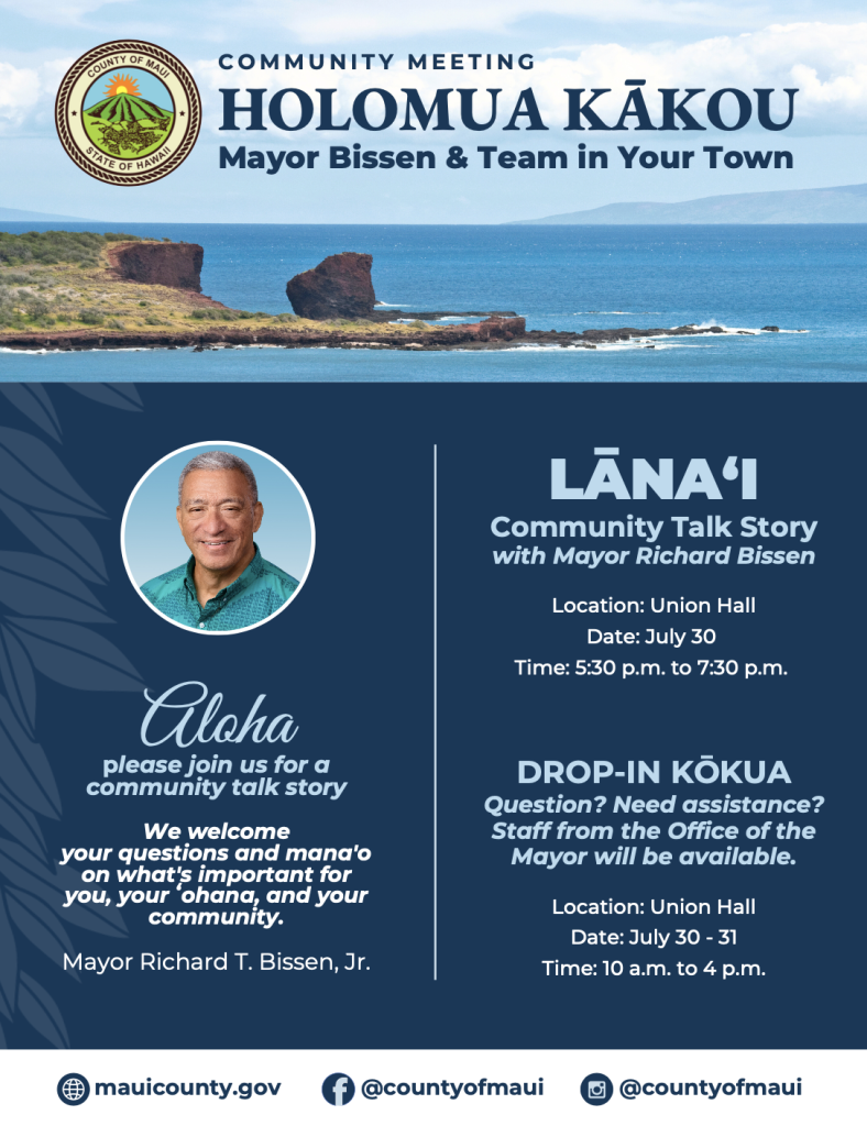 “Mayor Bissen and Your Team in Your Town” events will be held on Lānaʻi on Wednesday, July 30, and Thursday, July 31, 2025. Office of the Mayor staff will be available to answer questions and provide assistance from 10 a.m. to 4 p.m. both days at the ILWU Union Hall, 840 Ilima Ave., Lānaʻi City.