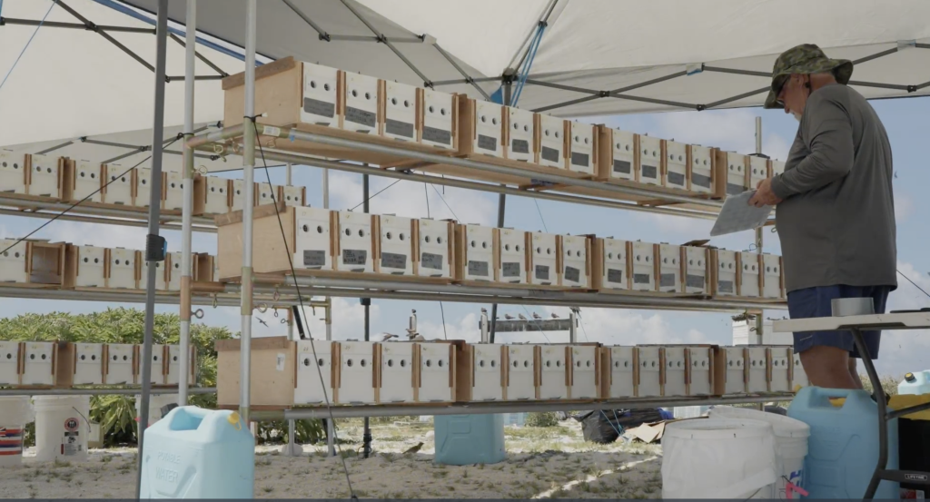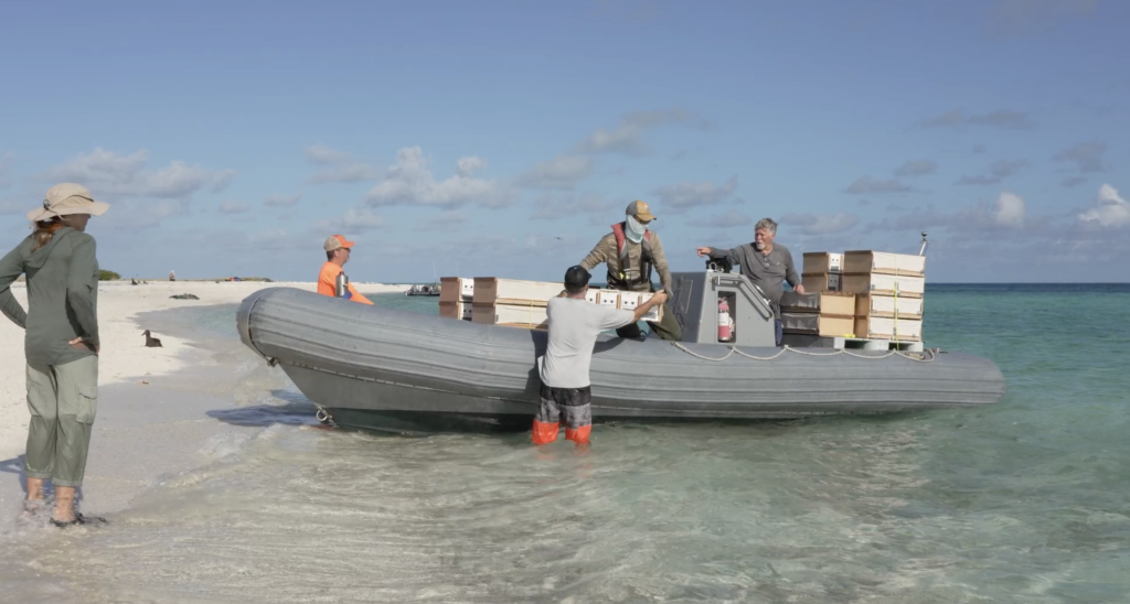 The team of biologists selected 100 finches from the neighboring atoll of Manawai (Pearl and Hermes Atoll) for over four days. When captured, the finches were banded with a unique set of color bands before being housed on island under the care of expert aviculturists. The finches hitched a ride to Kuaihelani for a long one-day journey aboard the M/V Imua, which was already navigating within the Monument on a National Oceanic and Atmospheric Administration expedition.