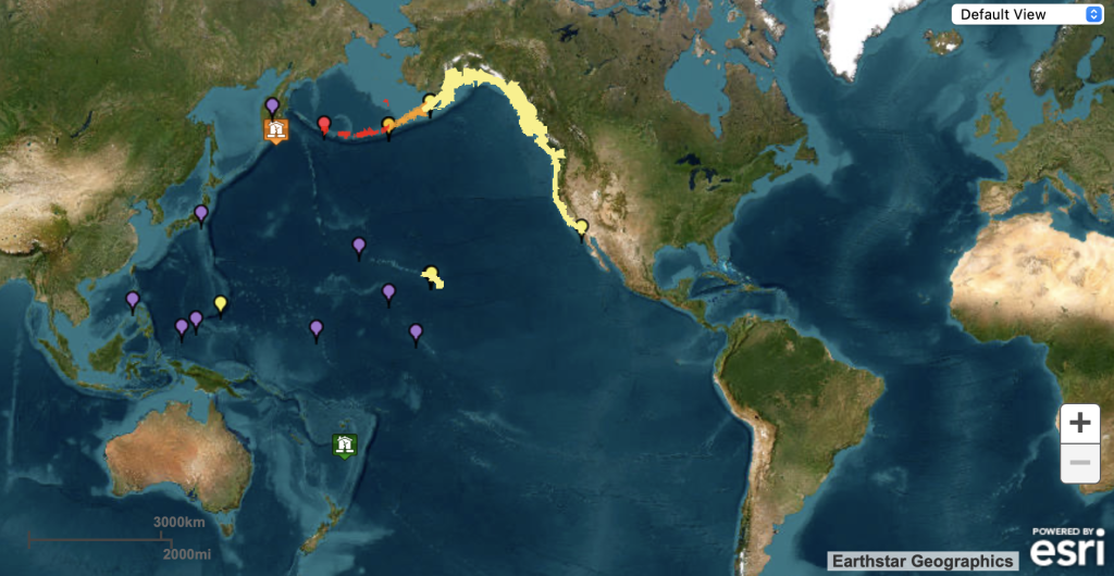 The monitoring buoys are all around the Pacific Rim, McCreery said, “so it’s pretty much hit all the buoys that we’re interested in. But out next reading should come from Midway Island, and it should actually start coming in right about now (5:30 p.m. Hawaiʻi time), but it’ll take roughly a half an hour before we see the full cycle of the wave.”