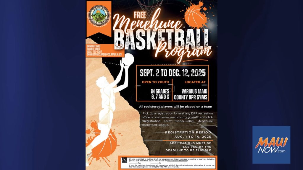 Registration for the Menehune Basketball Program runs through Aug. 14 for Maui island youth, the Maui County Department of Parks and Recreation announced. The free youth league will take place Sept. 2 to Dec. 12.