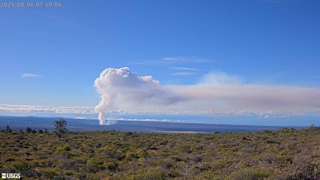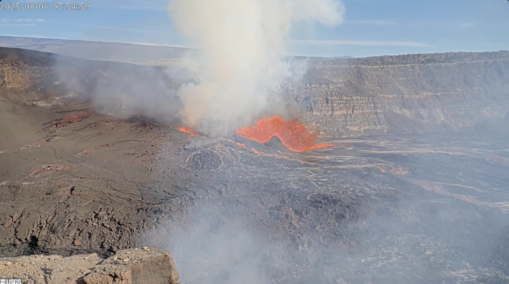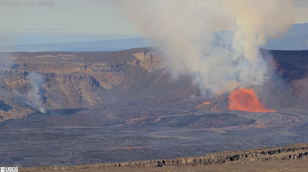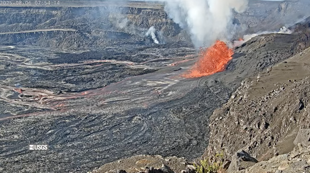 Episode 30 of the ongoing Halemaʻumaʻu eruption ended abruptly at 12:55 p.m. HST on August 6 after 12 hours of continuous fountaining. Lava flows continued to drain down the north cone for about 5 minutes after fountaining ceased, according to the Hawaiian Volcano Observatory.