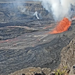 According to the HVO, there is a line of small fountains that formed south of the old south vent area that are producing lower volume flows. This appears to be a new vent for this eruption and seems to be associated with a cluster of small earthquakes just south of Halemaʻumaʻu, according to the HVO.