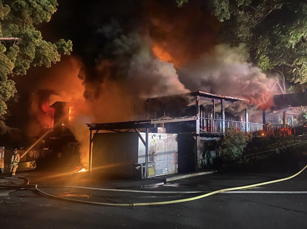 On Aug. 11, 2025 at around 3:19 a.m., a renter in one of the rooms at the Kula Lodge reported seeing flames coming from the Kula Lodge & Restaurant located at 15200 Haleakalā Highway, Kula.