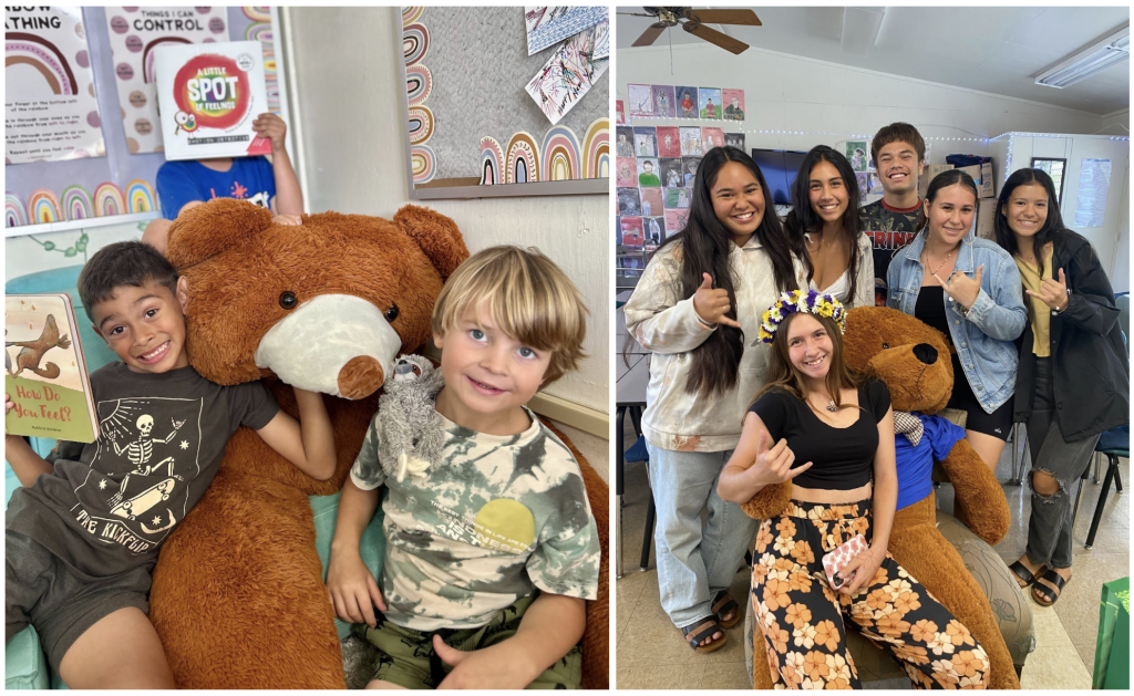 Picture to the Left – Students at Ha’ikū Elementary School with our Teddy Bear. Picture to the Right – Students part of King Kekaulike High School Hawaiian Immersion Program. PC: courtesy