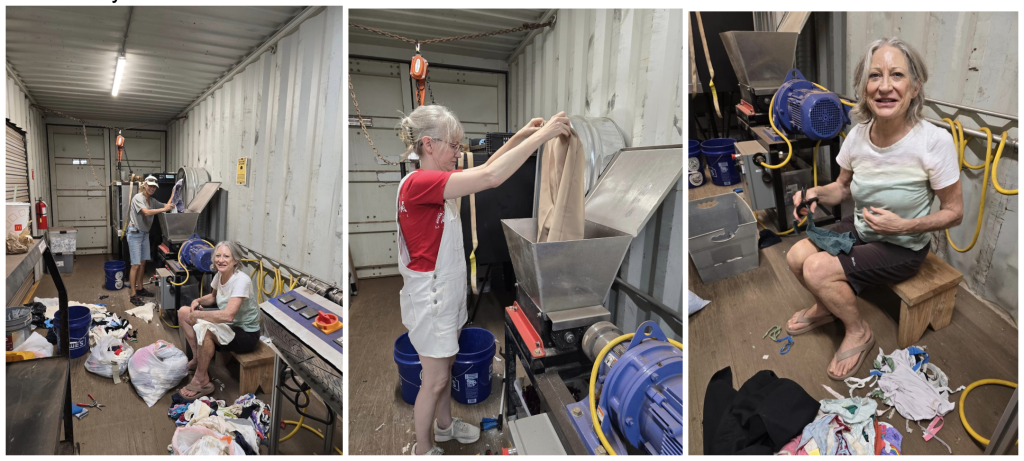 The Sewing Hui Volunteers Sally Daniels and Cheryl Bien, along with founder Jennifer Oberg, at Mālama Maui Nui’s site to shred textiles. PC: courtesy