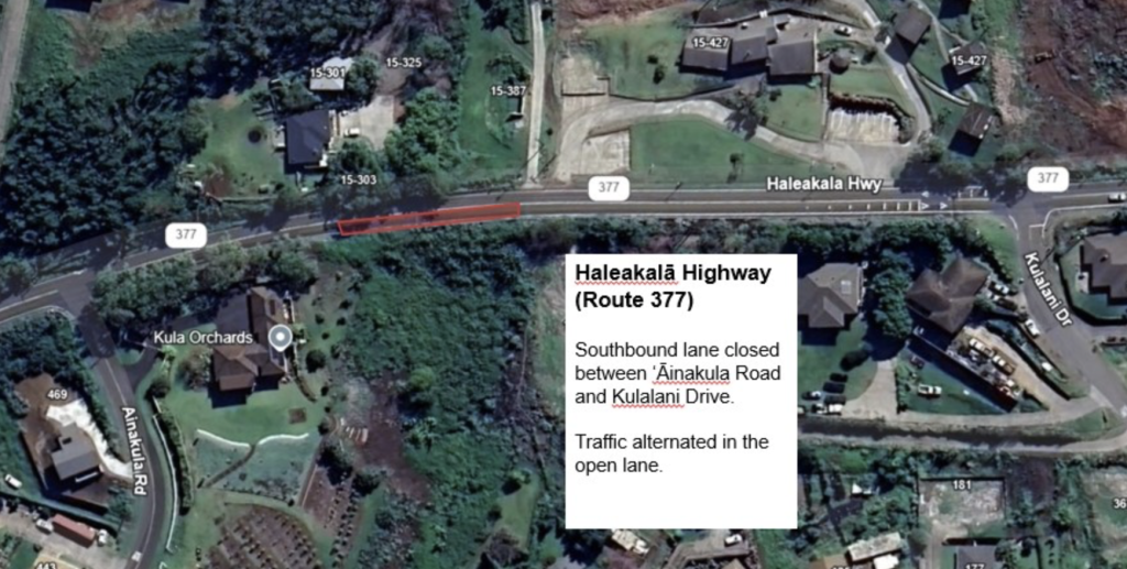 Motorists are advised that one lane on Haleakalā Highway (Route 377) between Kulalani Drive and ʻĀinakula Road in Kula, will be closed for slope and shoulder repair work, according to the state Department of Transportation.