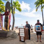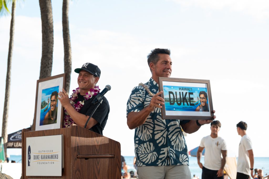 The Outrigger Duke Kahanamoku Foundation, in partnership with the City and County of Honolulu Division of Motor Vehicles, unveiled the design for a new Duke Kahanamoku specialty license plate on Friday during the opening ceremony of the Duke Kahanamoku OceanFest at the Duke Kahanamoku Statue in Waikīkī.