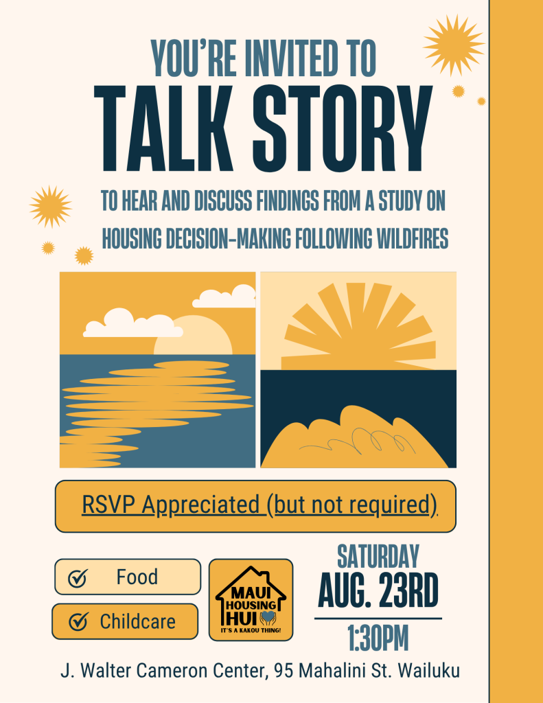 Maui Housing Hui, in collaboration with the University at Albany and the University of North Texas, will host a Talk Story event on Saturday, Aug. 23, 2025, to present new research findings on housing decision-making following the Maui wildfires.