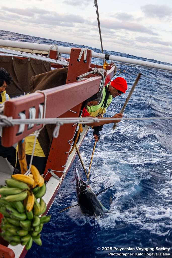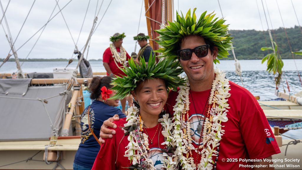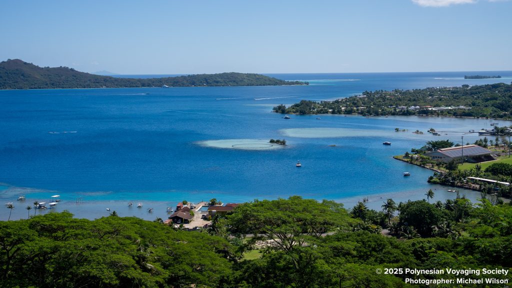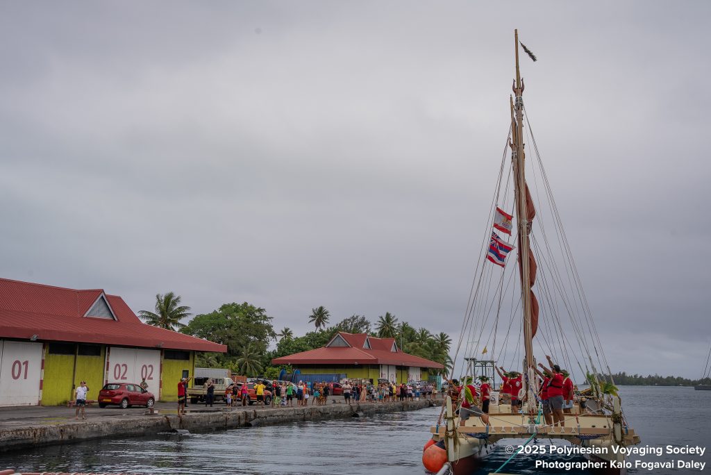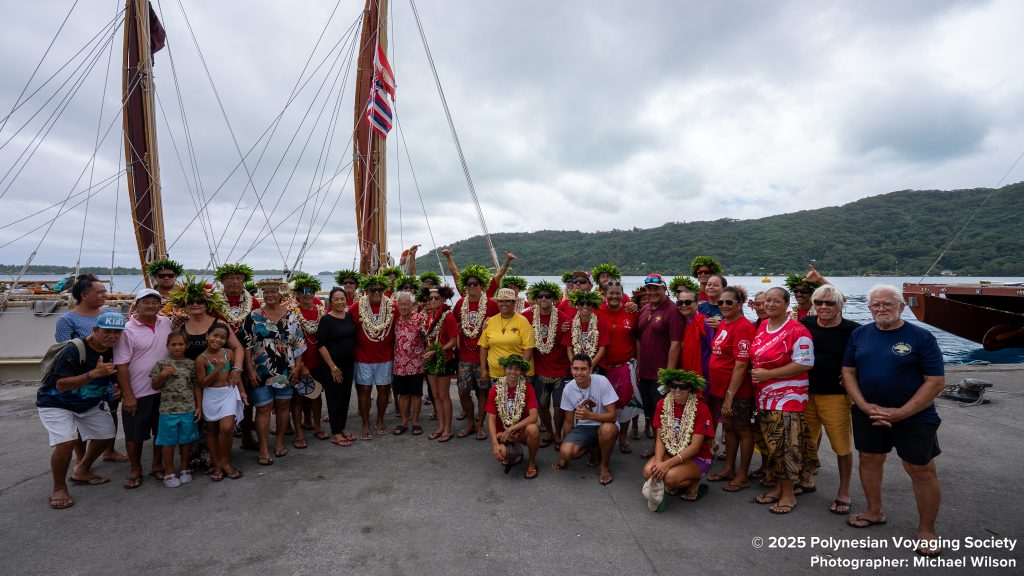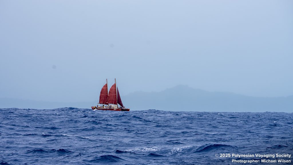 Weather has been challenging, delaying departure and extending the canoes’ and crews’ time in Bora Bora, according to the Polynesian Voyaging Society. Before departure, winds were shifting and suddenly strengthening, which required the crew to move Hōkūleʻan and Hikianalia to another dock for their departure. While at the Faʻanui Bay dock, the crew visited and gave offerings at the ancient marae Farerua, continuing a long tradition of honoring ancestral connections before sailing into the deep ocean.