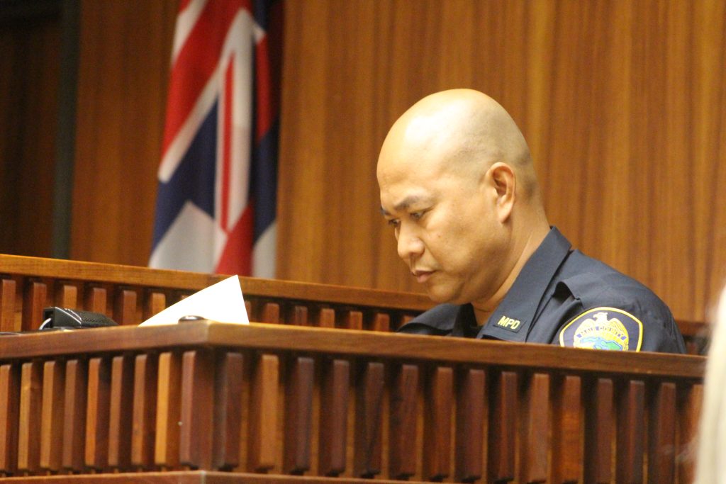 Detective Eduardo Bayle Jr., a 20 year veteran of the Maui Police Department said he was assigned response to the officer-involved shooting where he encountered Kaneholani, who was handcuffed and was receiving medical care.