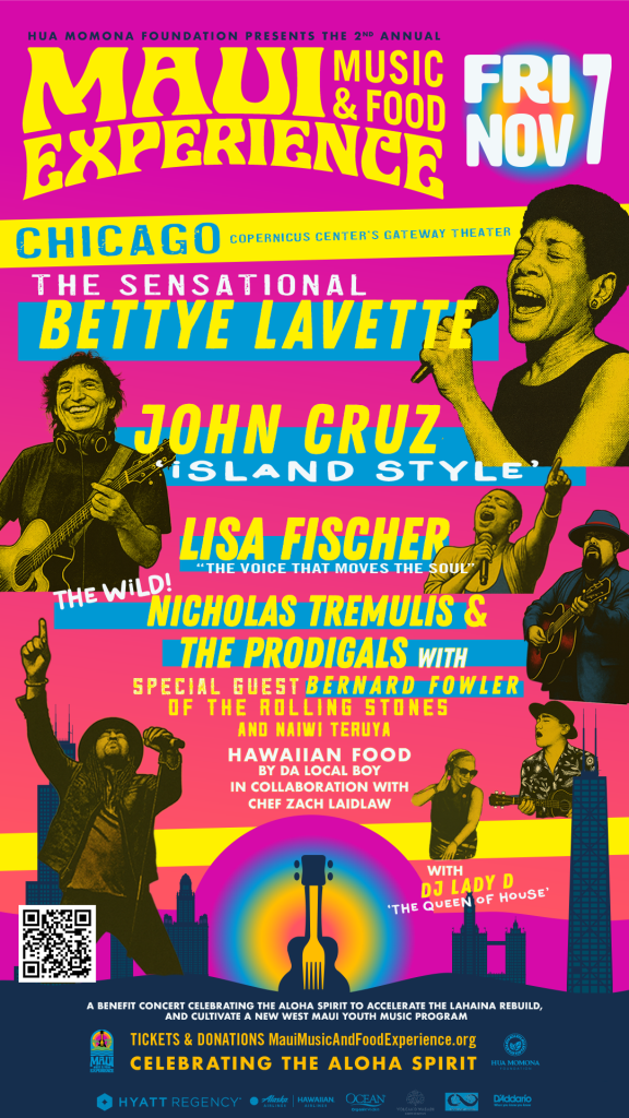 Headlining the night is soul icon Bettye LaVette, whose raw, unmistakable voice has defined a six-decade-long career. She’ll be joined by Grammy winner Lisa Fischer, the powerhouse vocalist known for her work with The Rolling Stones, and Chicago rock-and-soul mainstay Nicholas Tremulis & the Prodigals, featuring Stones collaborator Bernard Fowler. Together, LaVette, Fischer, and Fowler bring three of the world’s top soul voices to one stage. Rounding out the lineup is Grammy-winning Hawaiian native John Cruz, whose deeply personal songs have become local anthems, and Naiwi Teruya, a rising star from Lahaina who amazes audiences with his ukulele skills. Additionally, Chicago house music icon and trailblazer in the city’s dance scene DJ Lady D brings her signature sound and hometown pride to the event, setting the vibe between sets.