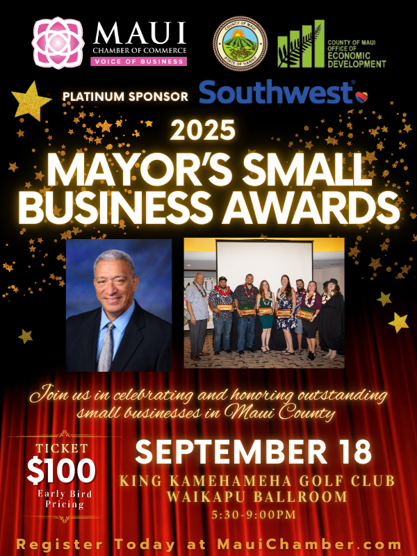 The Maui Chamber of Commerce announced the 2025 Mayor’s Small Business Awards, which will be held on Sept. 18.