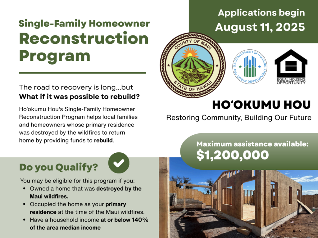 Hoʻokumu Hou, which is receiving a high volume of applications, offers Community Development Block Grant – Disaster Recovery (CDBG-DR) funding to individuals and families who meet eligibility criteria, including income limits and loss of property during the 2023 Maui wildfires.