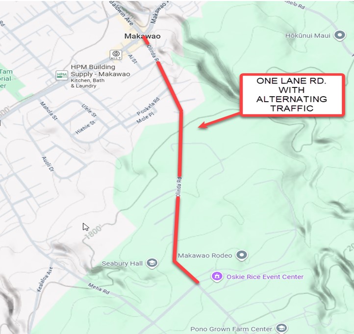 One lane will be open to alternating traffic on Olinda Road between Baldwin Avenue and Hanamu Road in Makawao due to pavement preservation work from 8 a.m. to 2:30 p.m. weekdays Sept. 3-19, 2025, according to the County of Maui Department of Public Works (DPW) Highways Division.