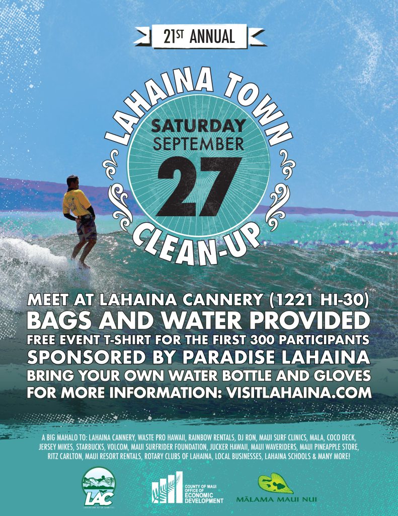 The 21st Annual Lahaina Town Cleanup, held in conjunction with the Ocean Conservancy’s “International Coastal Cleanup” and Mālama Maui Nui’s “Get the Drift and Bag It!” campaign, invites both residents and visitors to join this global movement to remove litter and debris from coastal environments.