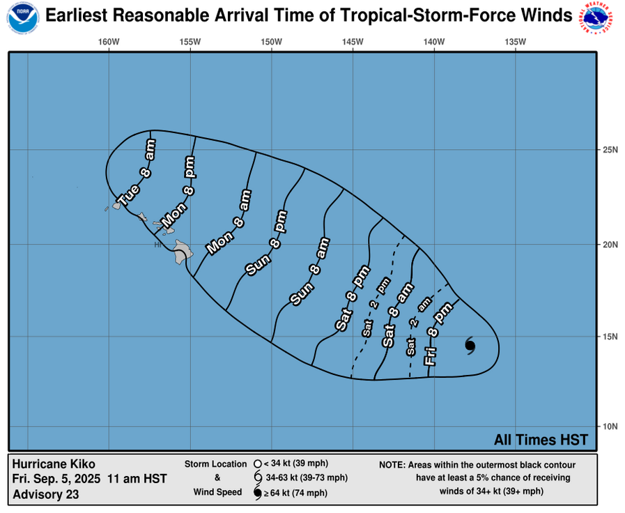 “Primarily windward rainfall will increase in response to approaching Tropical Cyclone Kiko early next week. Kiko is forecast to reach our far eastern offshore waters Monday. There is a fair amount of uncertainty that exists concerning Kiko’s eventual track, intensity and possible impacts,” according to the National Weather Service.