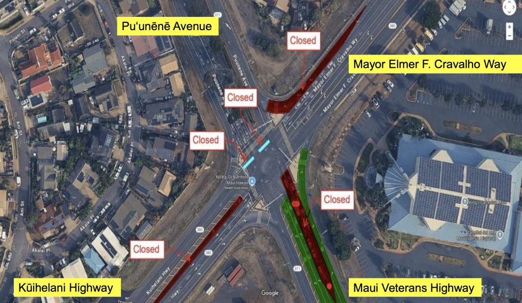 Highway users heading west on Mayor Elmer F. Cravalho Way will be prohibited from turning right onto Puʻunēnē Avenue. Highway users heading east on Kūihelani Highway will be prohibited from turning left onto Puʻunēnē Avenue.