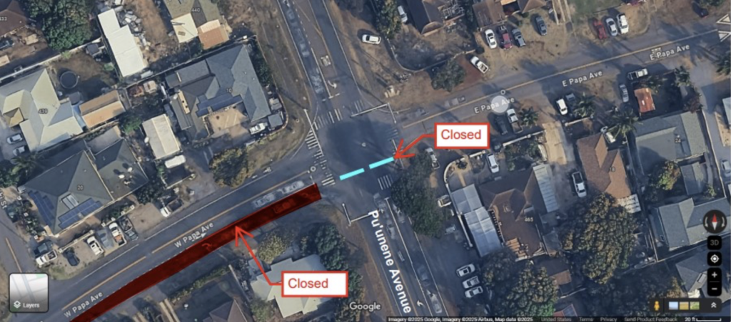 Access to homes on East and West Hawaiʻi streets will be through East Papa Avenue for residents only. Puʻukani Street at Puʻunēnē Avenue will be be closed.