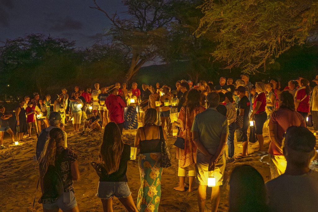 The Light March became the centerpiece of the gathering, drawing more than 350 participants who were transported by Polynesian Adventure Tours to Puʻunoa Beach. From there, the community walked together back to the church, passing historic sites along the way. Thousands of lanterns and solar lights lit the shoreline and seawall, where volunteers — including many impacted by the 2023 wildfire — placed lights during a moment of silence before voices rose together in “Hawai‘i Aloha.”