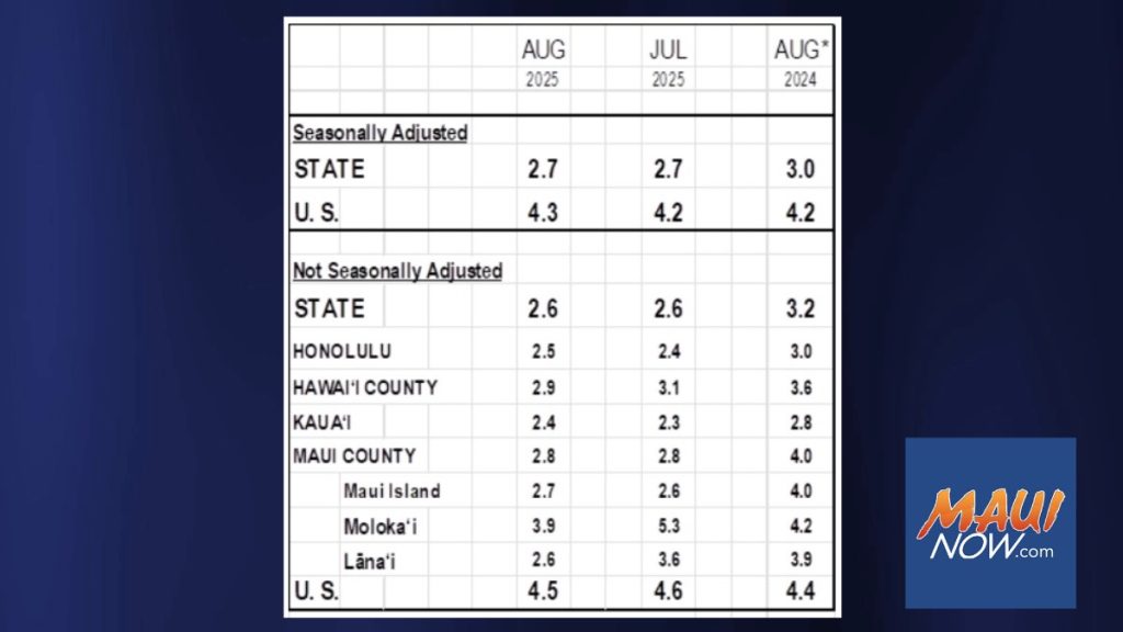Maui island’s unemployment rate in August was 2.7%, down significantly from 4% in August 2024. Molokaʻi’s rate was 3.9% last month, down from 4.2% a year earlier; and Lānaʻi’s rate was 2.6%, down from 3.9% in August last year.