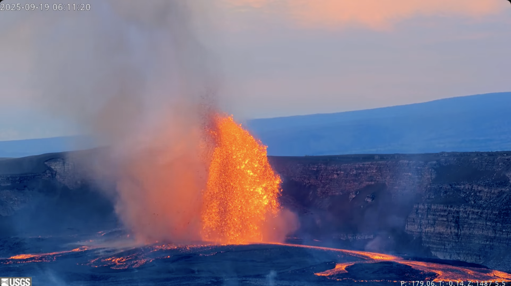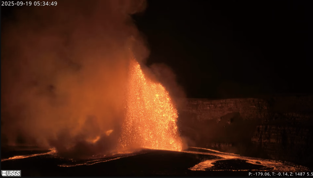 Episode 33 of the ongoing Halemaʻumaʻu eruption began at 3:11 a.m. HST on Friday, Sept. 19 and is currently fountaining within the summit caldera. Current fountain height is greater than 500 feet and the convective plume is about 10,000 feet AGL, according to the Hawaiian Volcano Observatory.