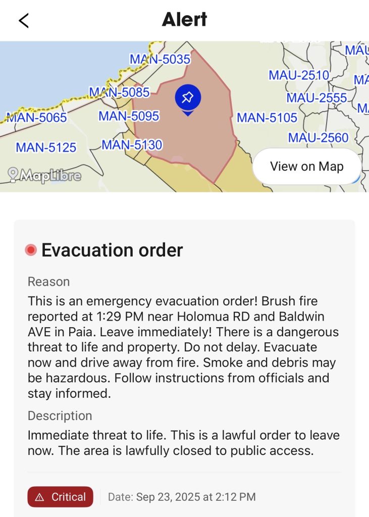 As of 2:25 p.m, an evacuation order was issued for a portion of Pāʻia. This is due to a brush fire reported at around 1:29 p.m. on Tuesday, Sept. 23, 2025 near Holomua Road and Baldwin Avenue in Pāʻia.