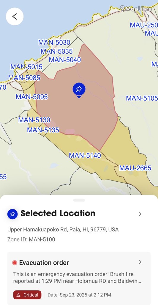 MEMA issued evacuation orders just after 2 p.m. today for multiple areas in Pāʻia via EAS, WEA, Genasys, MEMA Alerts and a siren; Maui Police Department had conducted door-to-door evacuations prior to MEMA’s evacuations. For specific zone locations, visit https://protect.genasys.com/search or download the Genasys Protect app.