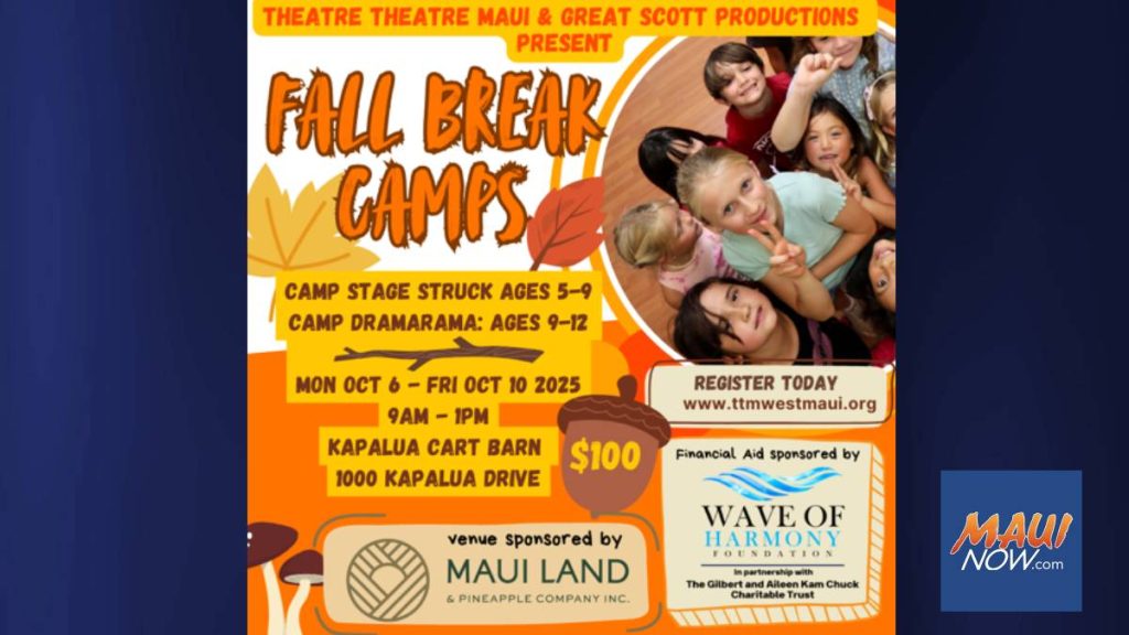 Registration is open for Theatre Theatre Maui’s Fall Break camps, a week of performing arts activities designed for children ages 5-12. The camps run from Monday, Oct. 6 through Friday, Oct. 10, 9 a.m. to 1 p.m. daily.