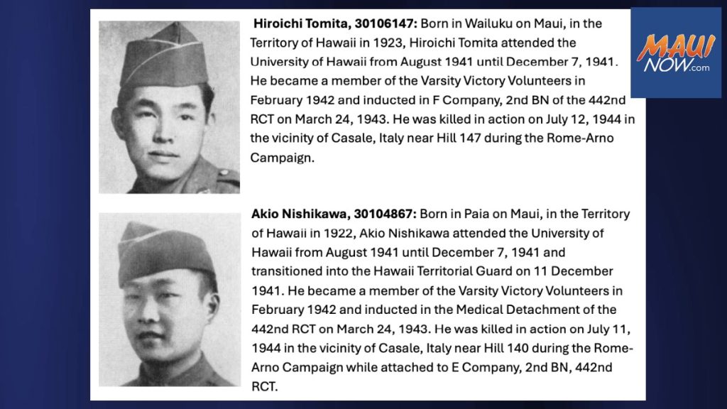 The honor includes two soldiers who were born in Maui County: Private First Class Hiroichi Tomita, who was born in Wailuku, and Private Akio Nishikawa, who was born in Pāʻia.