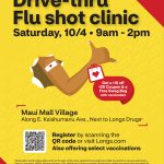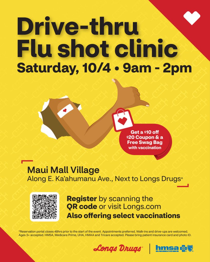 Shoppers who spend $100 or more at participating stores between Sept. 27 and Oct. 5 can redeem receipts for a $20 gift card at Maui Candy Company during its business hours. Gift card choices include Baskin-Robbins, IHOP, Genki Sushi, Kahului Ale House, Tanaka Ramen, Regal Maui Mall 12, Subway or Tasaka Guri-Guri (while supplies last). - Longs Drugs Drive-Thru Flu Shot Clinic (Oct. 4)