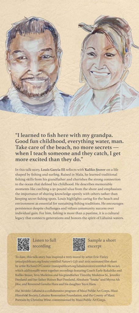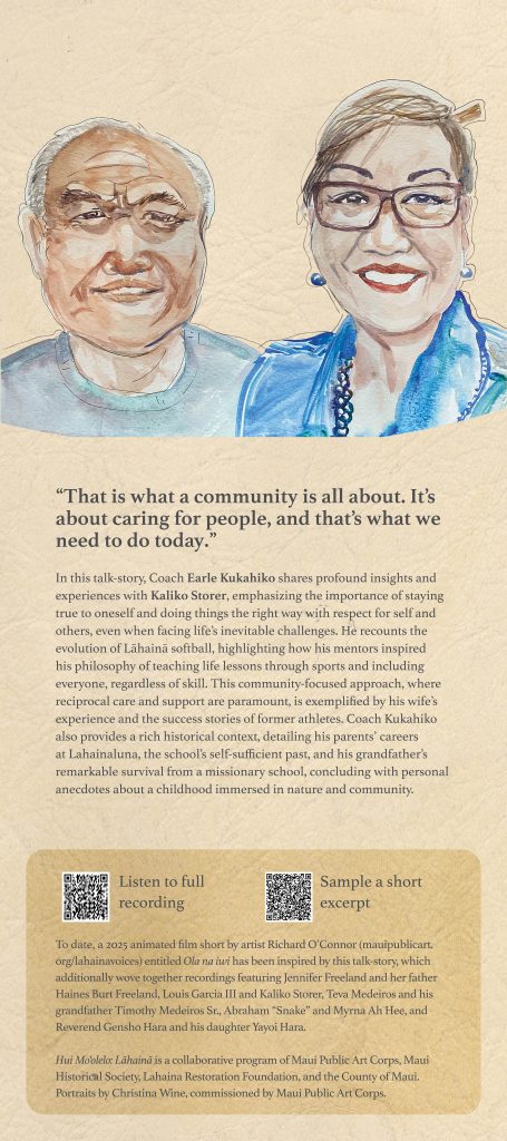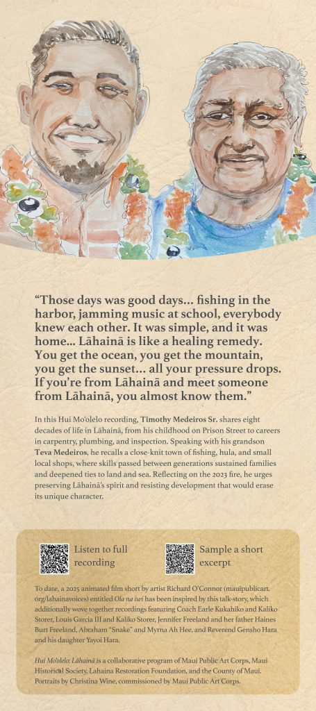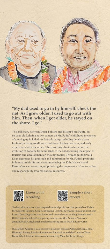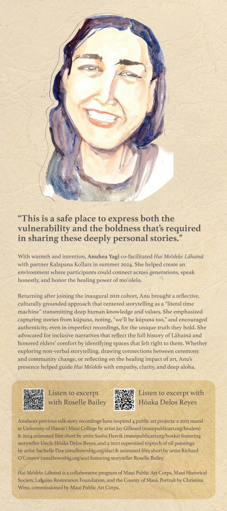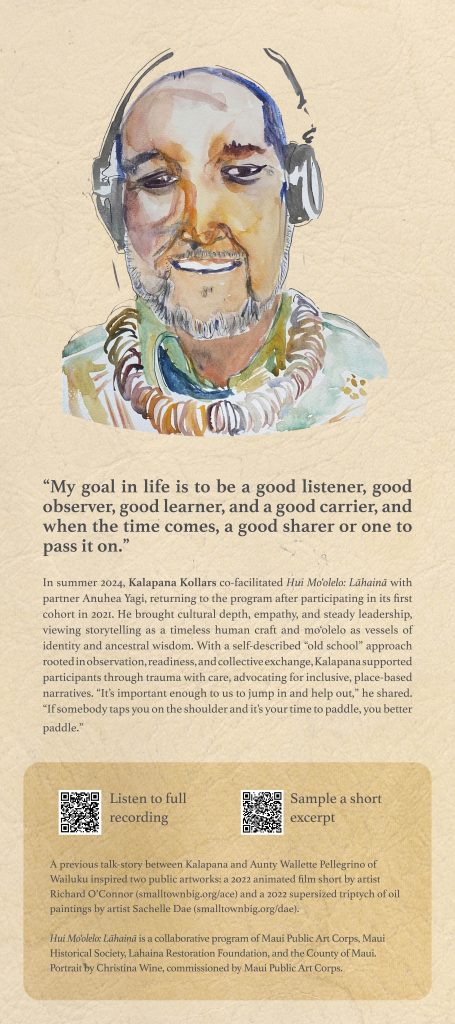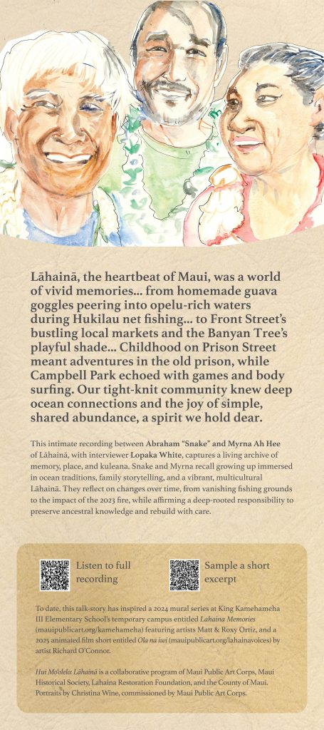In summer 2024, cultural historian Kalapana Kollars and Hawaiian life ways practitioner Anuhea Yagi guided a cohort of Lahaina storytellers in recording intergenerational stories of life in the community; recollections that spanned hukilau at Launiupoko, fishing ʻōpelu at Māla, lantern ceremonies at the Jodo Mission, and the hum of Front Street.