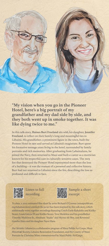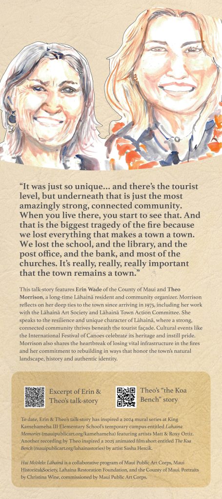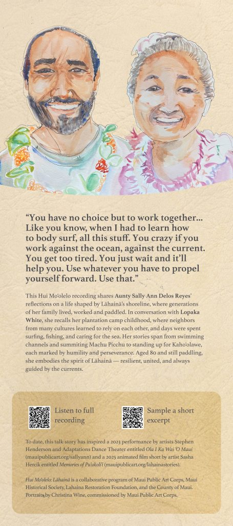 The Hui Mo‘olelo: Lahaina exhibition is free and open to the public through the month of September. Learn more: mauipublicart.org/lahainamoolelo.