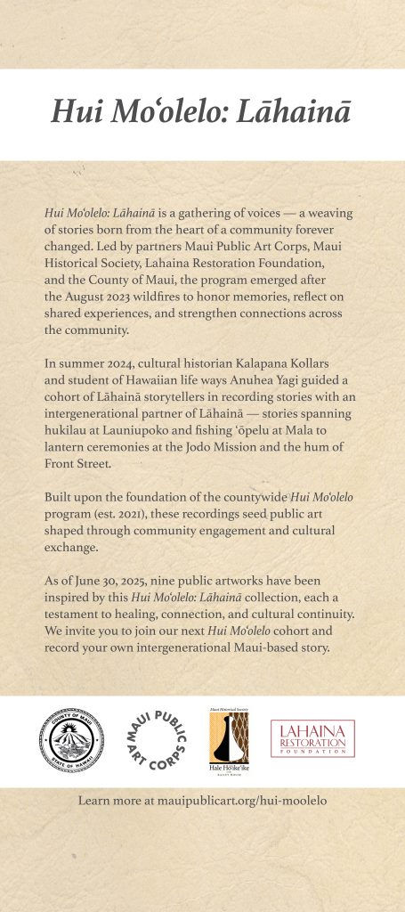 Launched in response to the August 2023 wildfires, Hui Mo‘olelo: Lahaina brings together the efforts of Maui Public Art Corps, Lahaina Restoration Foundation, and the County of Maui.