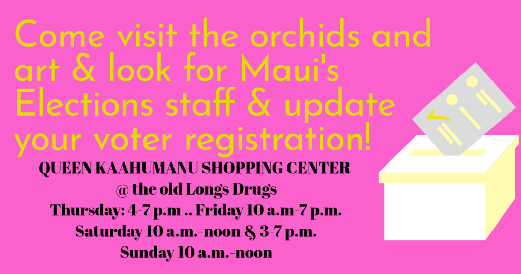The Elections Division for the County of Maui will be available to register new voters, update current voter information and answer questions during the Maui County Fair at Queen Kaahumanu Shopping Center in the old Longs Drugs store, near Macys.