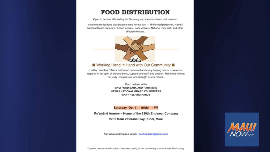 In response to the ongoing impacts of the federal government shutdown, volunteers across Maui have come together to host Operation Kokua Maui ʻOhana, a community food distribution taking place from 10 a.m. to 1 p.m. Saturday at the Hawaiʻi Army National Guard Armory, 230th Engineer Company. It is located at 2701 Maui Veterans Highway.