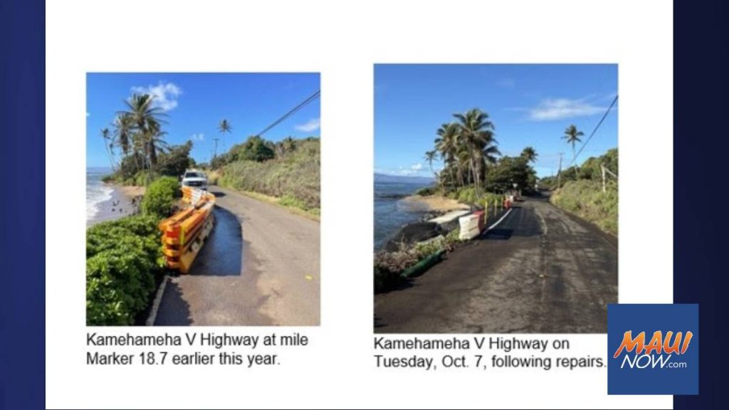 The Hawai‘i Department of Transportation completed emergency road repairs on Kamehameha V Highway (Route 450) on Moloka‘i and is reopening the eastbound lane at mile post 18.7 near Waialua Stream on Tuesday, Oct. 7.
