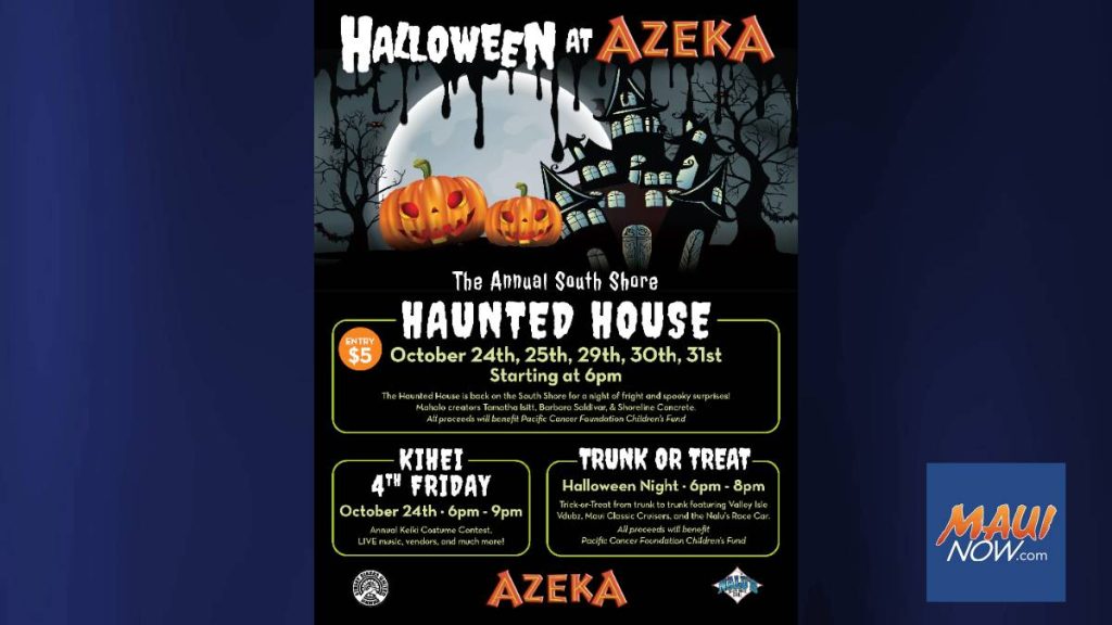 Azeka Shopping Center announces the return of the South Shore Haunted House, open Oct. 24, 25, 29, 30 and Halloween night (Oct. 31) starting at 6 p.m. at Azeka Makai near Nalu’s South Shore Grill.
