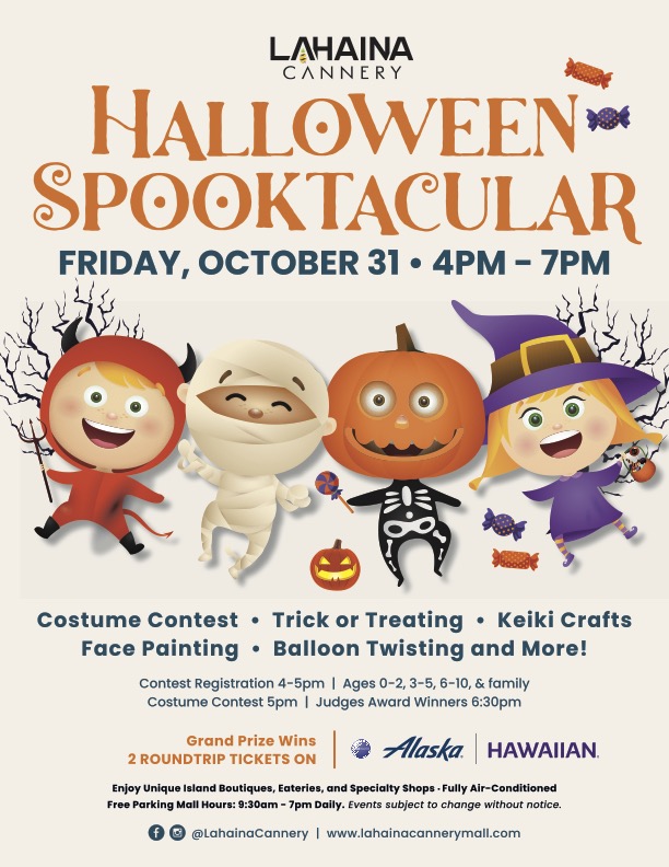 “Halloween at Lahaina Cannery has become such a fun community tradition,” said Lynn Okamoto, general manager of Lahaina Cannery. “We’re excited to welcome families back again this year and grateful to Alaska Airlines and Hawaiian Airlines for helping us offer such an amazing grand prize.”