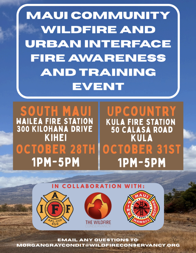 The public is invited to attend two events focused on Community Wildfire and Urban Interface Awareness. The events will be hosted by the Maui County Department of Fire and Public Safety, presented in collaboration with the International Association of Fire Fighters and the Wildfire Conservancy.