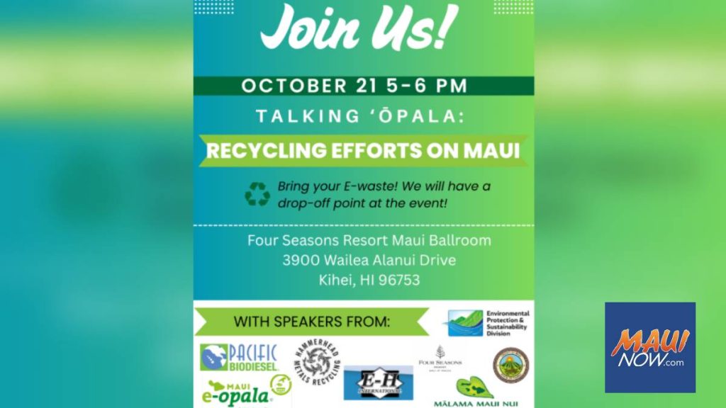 Mālama Maui Nui’s Talking ʻŌpala Environmental Speaker Series returns this month with a focus on “Recycling Efforts on Maui.” The fourth session of the series will take place on Monday, Oct. 21, from 5 to 6 p.m. at the Four Seasons Resort Maui Ballroom in Wailea.