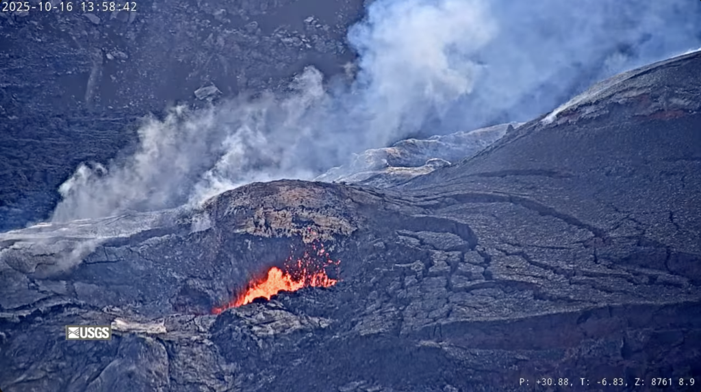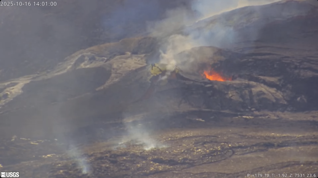 Precursory low-level activity for episode 35 of the ongoing Halemaʻumaʻu eruption increased on Thursday morning, Oct. 16, 2025, with a series of lava overflows and drainbacks occurring from the south vent.