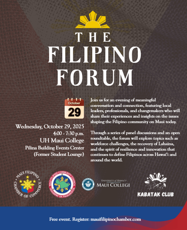 In celebration of Filipino American History Month, the Maui Filipino Chamber of Commerce, together with the Maui Filipino Community Council and UH Maui College Kabatak Club, will host The Filipino Forum on Wednesday, Oct. 29, 2025, from 4 to 7:30 p.m. at the University of Hawaiʻi Maui College Pilina Building Events Center.