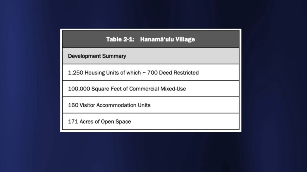The developer states the village is designed to meet the island’s “critical need for housing.” According to the project filing, the 2024 Hawaiʻi Housing Planning Study projected that Kauaʻi County would need approximately 4,914 new housing units by 2027.