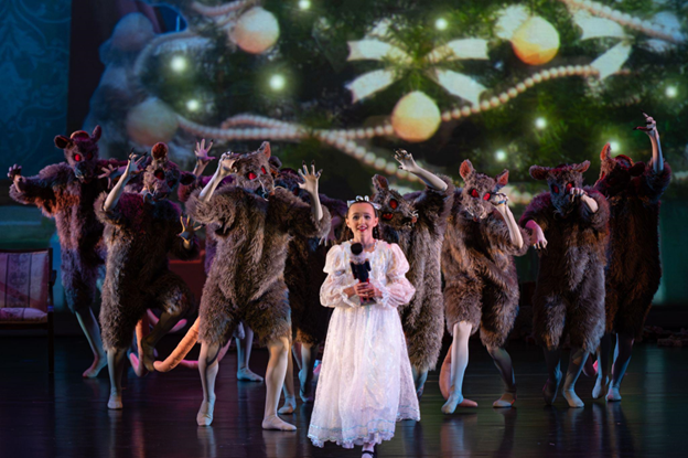 Artistic Director Absalon Figueroa leads sweeping choreography that transforms the stage, from snow-filled forests to the grand finale. Choreographers Amelia Nelson and Hallie Hunt contribute theatrical depth, designing everything from the festive Act I party to the dramatic battle with the Rat King.