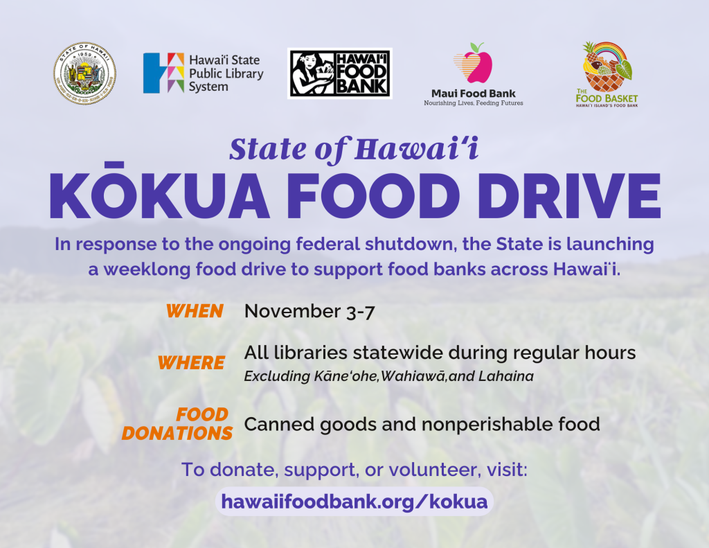 “Libraries have always been the heart of our communities, where people connect and care for one another,” said State Librarian Stacey Aldrich. “We’re honored to support the Kōkua Food Drive and hope our collective efforts help nourish every person and family across Hawaiʻi.”
