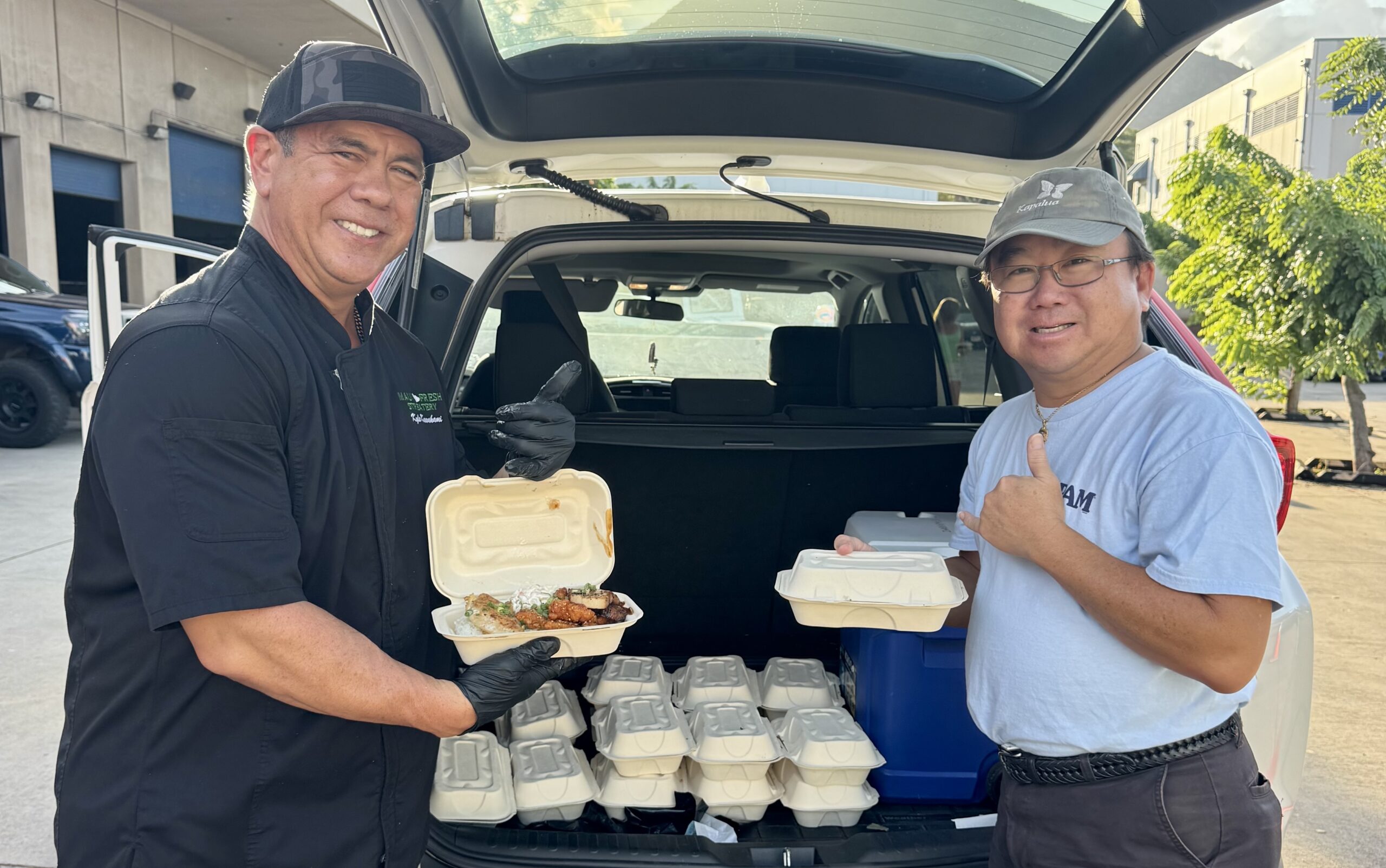 Kyle Kawakami of Maui Fresh Streatery and cousin Shane Kawakami prepare to deliver bentos last month to federal workers who aren’t getting paid during the shutdown. Photo courtesy: Kyle Kawakami