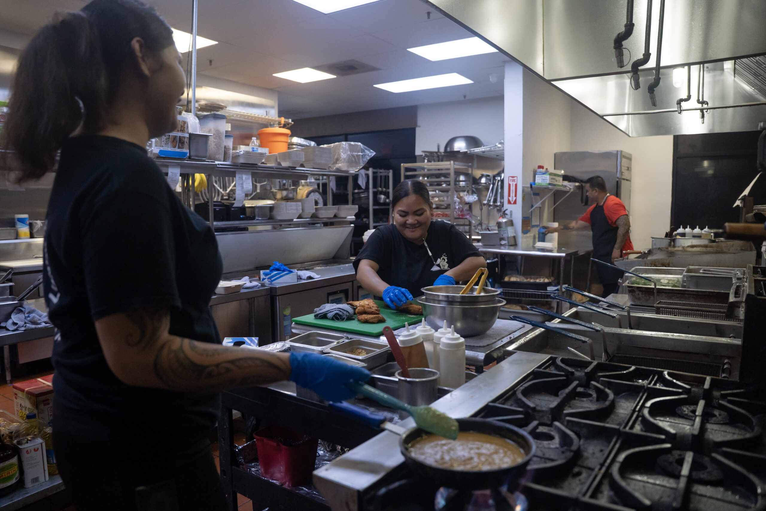 Sauté cook Kawailena Teeter (from left) and supervisor Manilyn Blando whip up chicken cutlets and curry sauce as supervisor Noel Agmata cleans up in Kalei’s kitchen on Tuesday. HJI / COLLEEN UECHI photo