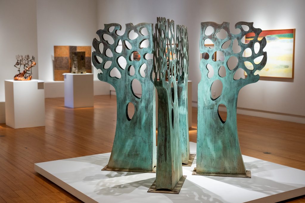 In 1970, he moved back to Hawaiʻi permanently, becoming a fixture of the local arts community with frequent solo exhibitions in Honolulu and numerous awards and honors throughout his career. He consistently produced work in both two- and three-dimensions, shifting between paint, wood, and metal in his explorations of recurring themes and motifs of rocks, seed forms, roots, and trees—whose armlike branches reach outwards to the sun or moon.