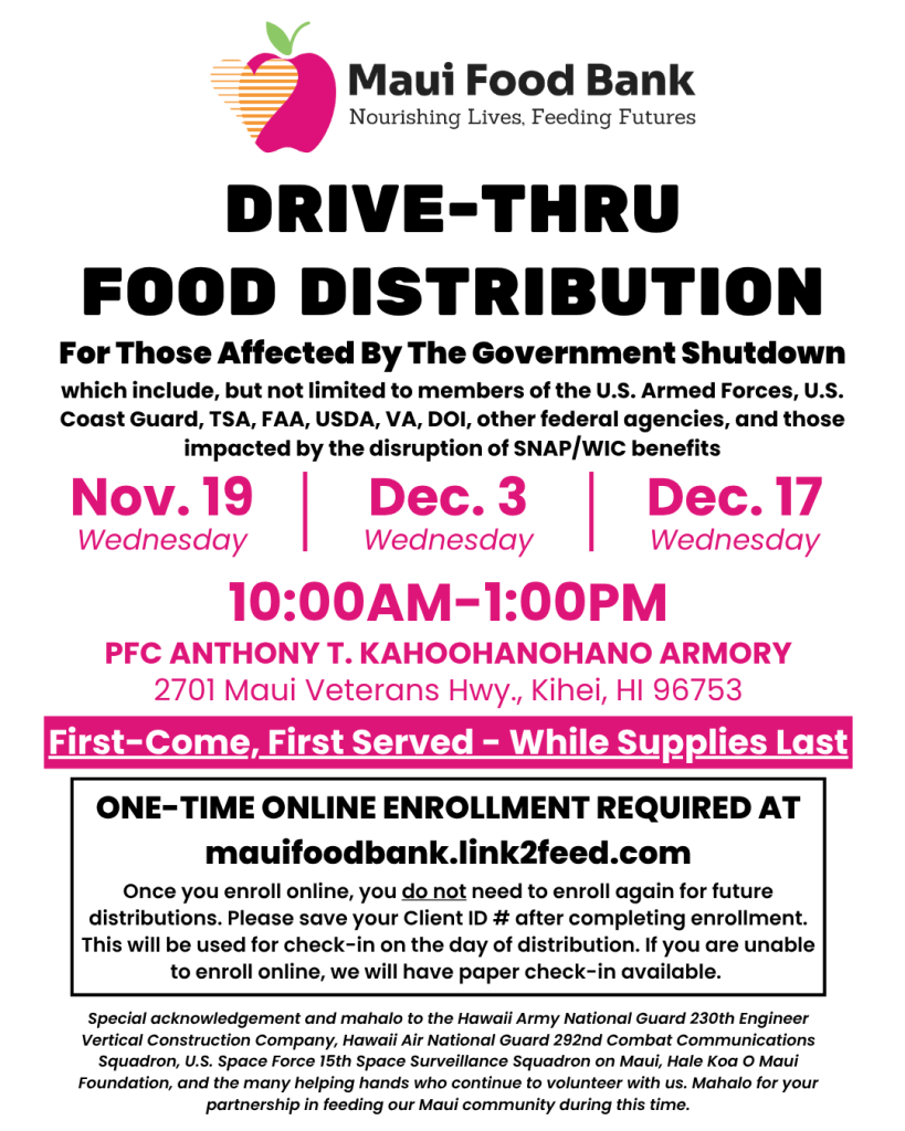 The Maui Food Bank has announced it will hold three drive-thru food distributions for residents affected by the recent government shutdown.